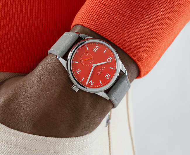 ローマン文字とアラビア文字が混じった、遊び心満載の文字盤が力強い印象を与えながら、繊細なアクセントを持つディテールがデザインを完全なものとしています。「ノンストップレッド」は時刻表示の数字とマーカー、分目盛りの数字が爽やかなライトブルーで縁取られ、アウトラインのコントラストを作ります。「エンドレスブルー」は数字とマーカーの縁にバイオレット、分目盛りの数字にミントグリーンを配し優美なコントラストを生み出しています。セコンドダイヤルのネオンオレンジの針は若々しいアクセントを生み出し、高品質なグレーカラーのヴィーガンストラップが現代的な印象を与えています。
