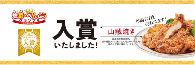株式会社綿半ホームエイド(本社:長野県長野市、代表取締役社長 牧島 禎彦)が運営する綿半スーパーセンターの人気惣菜商品「塩尻名物 おれの山賊焼き」が、日本食糧新聞社主催の「ファベックス惣菜・べんとうグランプリ2023」にて入賞いたしました。