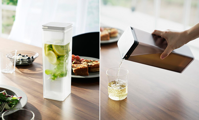 冷蔵庫のドアポケットに収まる両方から注げる冷水筒。