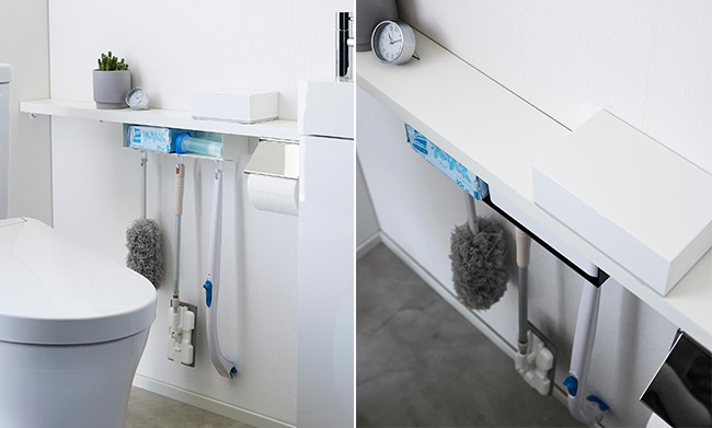 フック付きで様々なトイレ用品や掃除アイテムをまとめて収納できます。