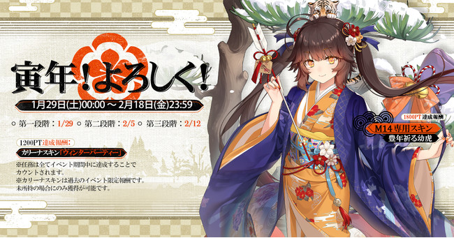 カリーナスキン「ウィンターパーティー」(未所持の場合のみ獲得が可能)や1,800ポイント達成時にはM14専用スキン「豊年祈る幼虎(ほうねんいのるようこ)」が獲得できますので、こちらを目指して任務をこなしましょう!
