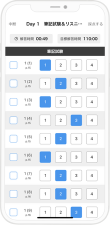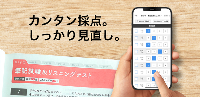 オンラインマークシートに解答を入力し、「採点する」を選択すると瞬時に採点結果が表示されます。リスニング問題は、再生ボタンで音声が流れるため、音声ソフトなどで別に再生する手間がありません。記述式などの一部の問題は、模範解答例が表示されるので、自己採点が可能です。シンプルな操作で、採点結果を把握し、履歴を残すことができ、とても便利です。