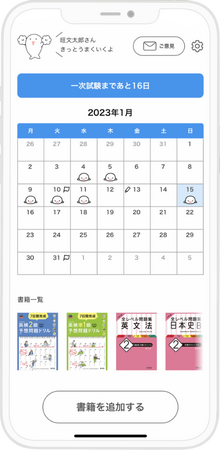 アプリを立ち上げるとアプリキャラクター「まなまる」が応援メッセージとともに迎えてくれます。学習するとカレンダーに「まなまる」が表示され、毎日の学習状況を確認することができます。目標とする試験日を入力すると、日数カウントダウン機能も利用でき、日々の学習のモチベーション維持に役立ちます。