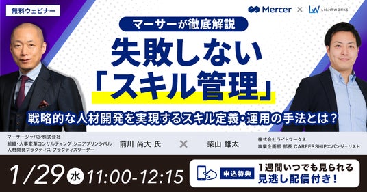 そこで本講演では、世界有数のHRコンサルティングファームであるマーサーが、当該分野における30年の実績と知見にもとづき、スキル定義や管理の具体的な方法をご紹介します。また、ライトワークスのパートでは、スキル管理をスキルマップに落とし込み、運用していくまでのイメージをお伝えします。