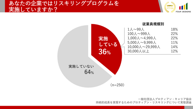 「あなたの企業ではリスキリングプログラムを実施していますか?」(n=250)と質問したところ、「実施している」が36%、「実施していない」が64%という回答になりました。