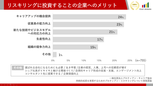 「リスキリングに投資することで、企業にどのようなメリットがあると考えていますか?(複数回答)」(n=755)と質問したところ、「キャリアアップの機会提供」が24%、「従業員の能力向上」が23%、「新たな技術やビジネスモデルへの対応力の向上」が21%、「生産性向上」が17%、「組織の競争力向上」が15%という回答になりました。「キャリアアップの機会提供」を筆頭に従業員のためになるメリットを挙げ、その次に、組織にとってのメリットが挙げられていました。企業が個人のキャリア・能力向上を支援することで、結果として企業も恩恵を受けることができるという、人的資本経営(※)の考えが浮き上がってくる結果となりました。
