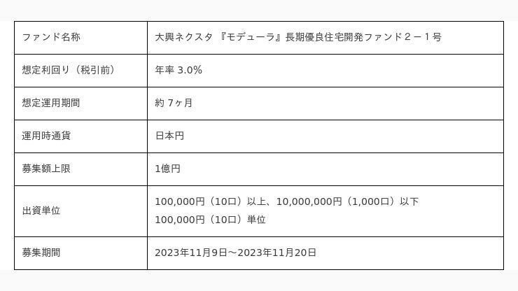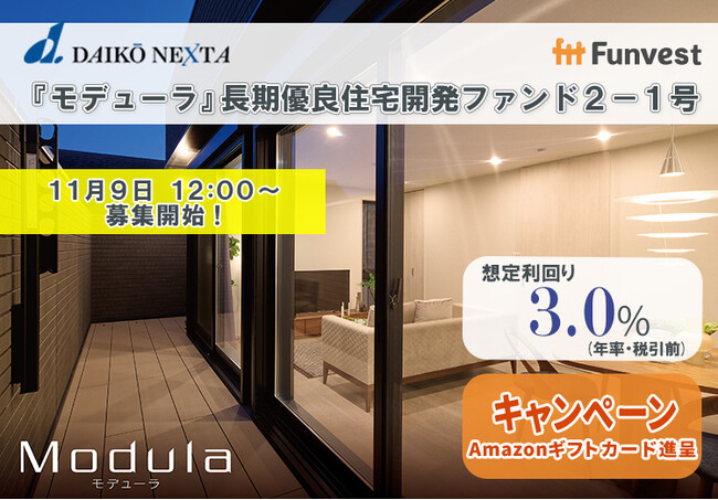 「未来をわかちあう投資」を提供する「Funvest(ファンベスト)」(以下、Funvest)は、「大興ネクスタ 『モデューラ』長期優良住宅開発ファンド2-1号」(以下、本ファンド)の募集を11/9より開始しますので、お知らせいたします。