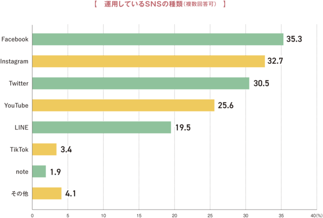 運用しているSNSの種類について尋ねると、「Facebook」(35.3%)が最多となりました。次いで「Instagram」(32.7%)、「Twitter」(30.5%)と3割を超える一方で、「TikTok」や「note」の運用度は低い結果となりました。