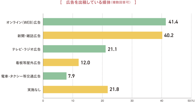 広告を出稿している媒体について尋ねると、「オンライン(Web)広告」(41.4%)、「新聞・雑誌広告」(40.2%)ともに4割を超える結果となりました。一方で、「実施なし」と回答した企業は21.8%となっています。