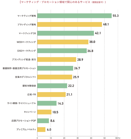 マーケティング・プロモーション領域で関心のあるサービスについて尋ねると、「マーケティング戦略」(55.3%)が最も多く、次いで「ブランディング戦略」(48.1%)と、戦略に関するサービスへの関心が高い結果となりました。また、「マーケティングDX」が42.1%と、よりデジタル化が進む中で新しい戦略構築が検討されている様子がうかがえます。