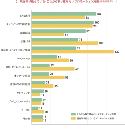 また、「現在取り組んでいる施策」として上位となった「展示会・イベント出展/開催」、「広報・PR」については、「これから取り組みたい施策」では大きく減少していることから、取り組み方を見直す時期に来ていると想定されます。