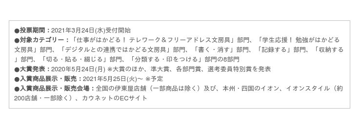 なお、発表された入賞商品は、「伊東屋」(一部商品は除く)及び「本州・四国のイオン、イオンスタイル」(約200店舗)にて展示・販売。また、オフィス用品の通信販売「カウネット」では、ノミネートから入賞まで一連の商品情報を掲載し、販売します。