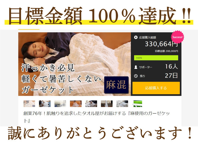 6月17日(金)よりスタート致しました。麻使用のガーゼケットが、開始からわずか3日で目標金額達成!沢山のご支援・応援ありがとうございました!