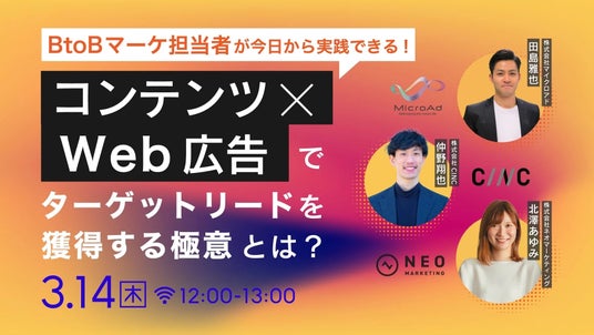 株式会社マイクロアド(本社:東京都渋谷区、代表取締役社長:渡辺健太郎、以下 マイクロアド)は、企業のBtoBマーケティング担当者に対し、株式会社CINC、株式会社ネオマーケティングとともにオンラインセミナーを開催いたします。BtoB向けのデジタルマーケティングにおける、リード獲得に効果的な戦略作りの方法とターゲットにリーチするための「コンテンツ×Web広告」の重要性と具体的な手法について解説いたします。