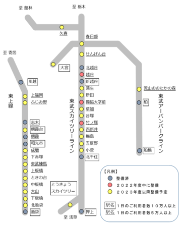 今回このうち、竹ノ塚駅の整備については、高架化事業に併せて設置するもので、列車での走行試験等、調整が完了後、ホームドアを使用開始します。