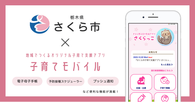 妊婦・子育て家庭に寄り添う「伴走型相談支援」のより一層の充実を図るため、栃木県内7自治体でも取り入れられている 子育て支援アプリ「子育てモバイル」を導入する運びとなりました。さくら市オリジナルのデザインを施し、「さくら市子育て支援アプリ さくらっこ」として提供いたします。