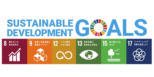 SDGsへの取組み:弊社サービスは主に8,9,12,13,15,17のテーマで取組を推進しています。
