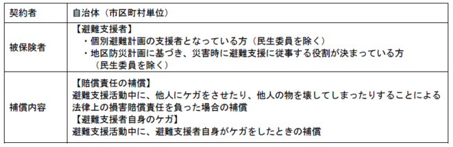 この保険は、避難支援活動中に避難行動要支援者にケガを負わせてしまった場合や、避難支援者自身が避難支援活動中にケガをした場合に保険金をお支払いします。