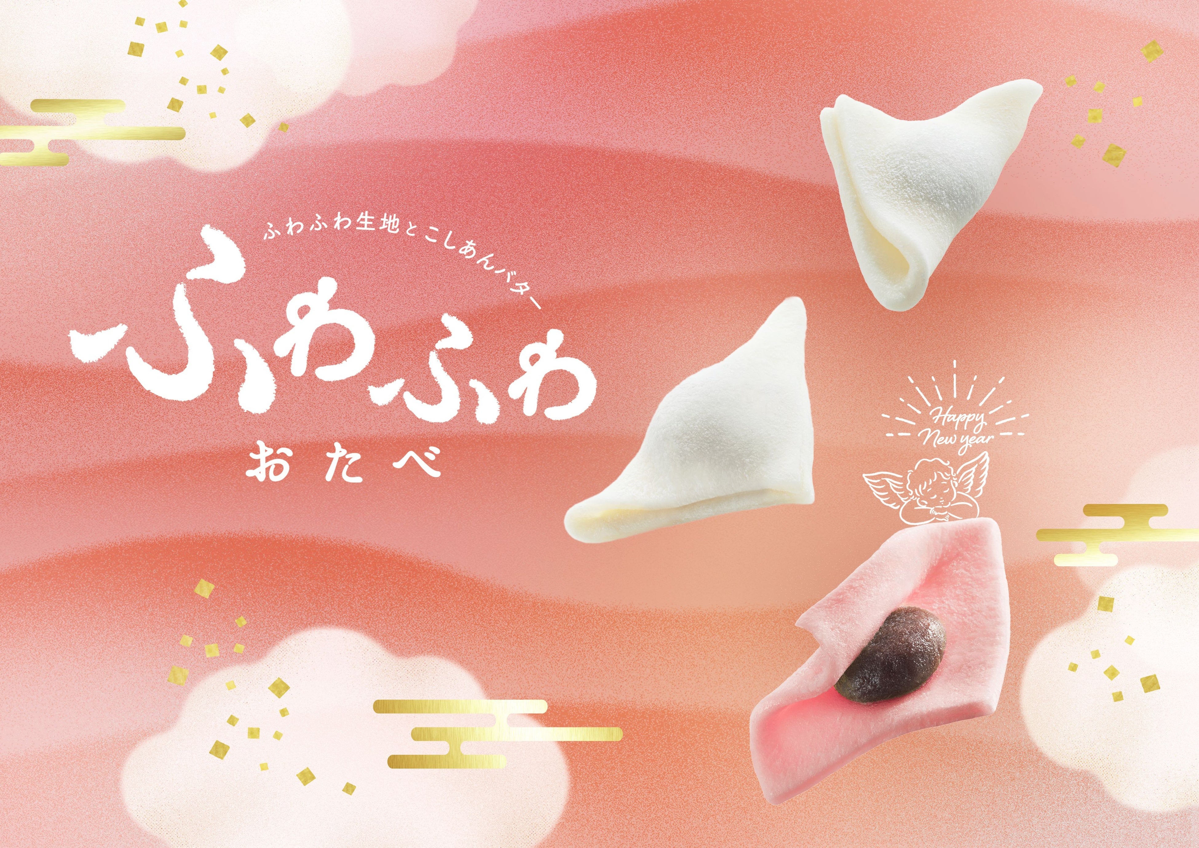 2025年3月に発売した、食感にこだわり抜いた「ふわふわおたべ」が、迎春の期間限定仕様で登場します。きめ細やかなもち粉にメレンゲを合わせたふわふわ食感の紅白の生地で、北海道十勝産小豆と国産バターを使いなめらかに炊き上げたこしあんバターを包みました。まるで雲のような軽やかさの生地が、迎春を華やかに彩ります。紅の生地を使用したふわふわおたべを3個、通常の白い生地のふわふわおたべを2個、計5個の詰め合わせです。