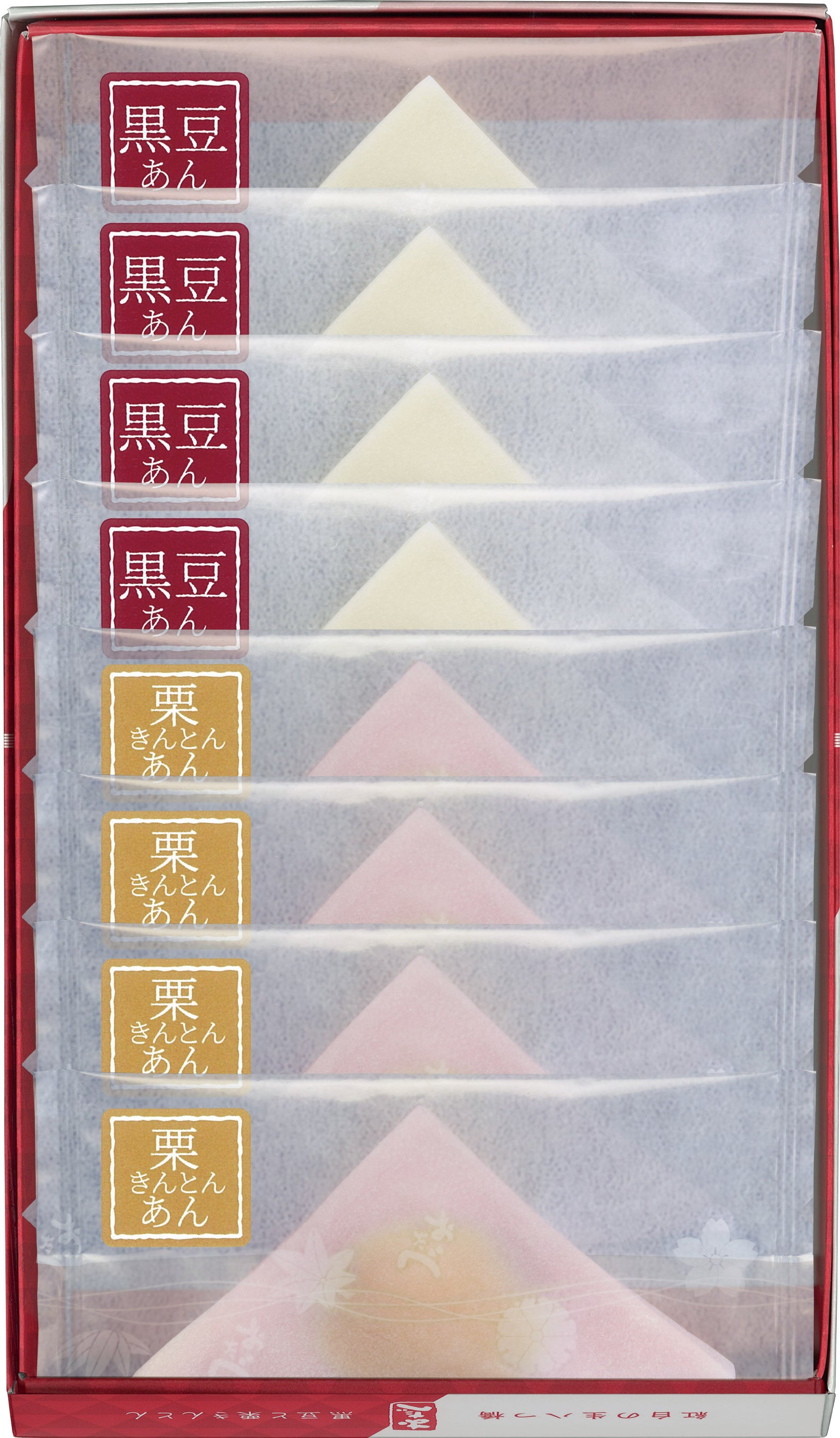 ふた口サイズのおたべをひとくちサイズにした、おたべのこども「こたべ」の迎春パッケージです。つぶつぶの栗つぶ入り「栗きんとんあん」をやさしく包み込んだひとくちサイズのこたべを詰め合せました。