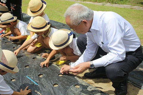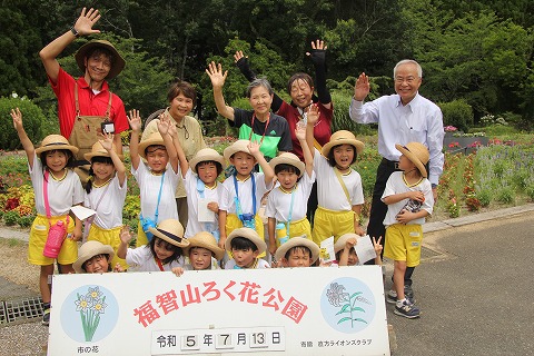 ※令和5年7月13日、花育体験後の集合写真(左から高下園長、新入幼稚園の児童と職員、大塚市長)