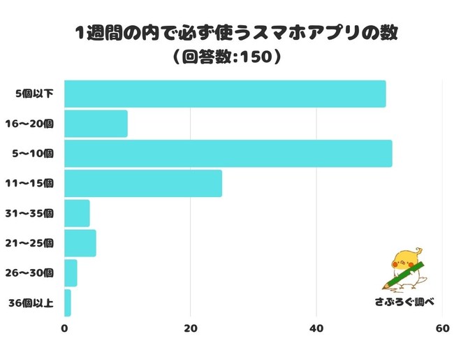 1週間の内で必ず使うスマホアプリの数をアンケートにて調査したところ、1位は「5~10個」でした。