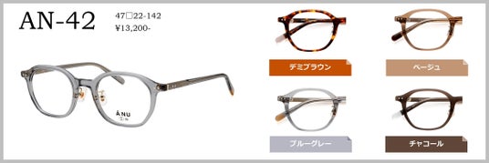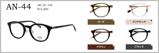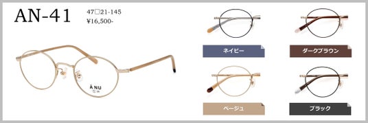 AN-41(47□21-145)ボストンの印象を取り入れたオーバルシェイプ。細身のリムデザインで知的な印象を与えますが、長モダンにしサイドに色を入れることで、カジュアルで優しい印象を演出します。カラーは、ネイビー、ダークブラウン、ベージュ、ブラックの4色。