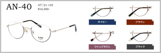 AN-40(47□21-145)優しい印象を与えるラウンドシェイプ。逆ナイロールの掛けにくいイメージを無くし、どんな顔タイプの方でも掛けることが出来るようサイズ感やフロントデザインにこだわったモデルです。カラーは、ネイビー、ブラウン、ワインブラウン、ブラックの4色。