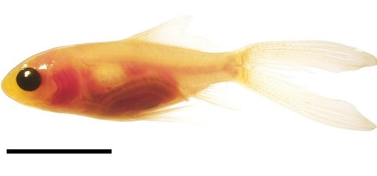 図1. 実験に用いた透明金魚の稚魚 スケールバーは1cm