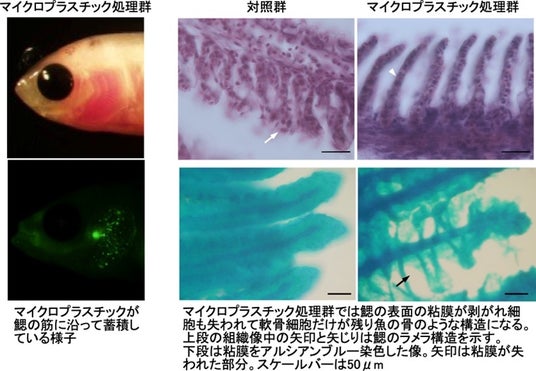 その結果、魚類では水中に存在するマイクロプラスチックに暴露された場合、まず鰓への蓄積が最初に起こることが明らかになった。鰓への蓄積が長期間続くと鰓組織が壊死して最終的には死に至る経過も観察でき、マイクロプラスチックの毒性を実証できた。