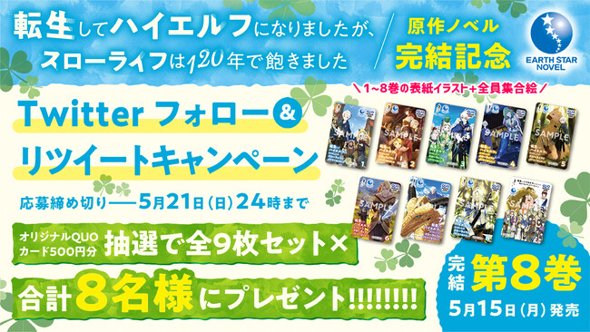 株式会社アース・スター エンターテイメント(東京都・品川区)が刊行する【アース・スターノベル】では、このたび「転生してハイエルフになりましたが、スローライフは120年で飽きました」最新第8巻発売&完結を記念して、特製QUOカードのプレゼントキャンペーンを開催中です。