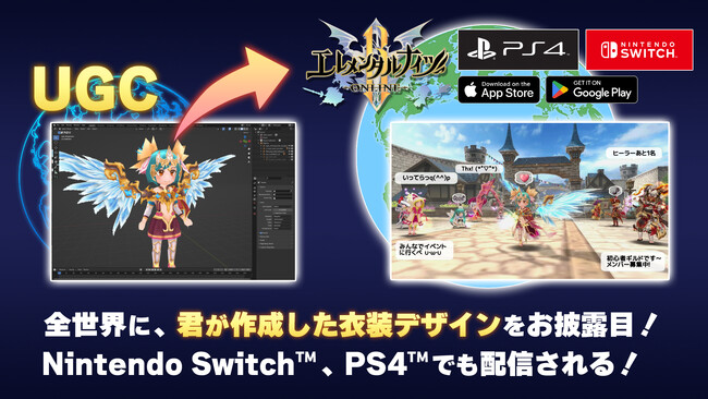 『エレメンタルナイツR』は、日本・アジア・北米・欧州など世界展開しているオンラインゲームであり、iOSとAndroidといったスマートフォンで遊べるほか、NintendoSwitch(TM)やPS4(TM)などの家庭用ゲーム機でも遊ぶことができるので、ユーザーが作成した衣装を、世界中、また多くのプラットフォームでお披露目をすることができるようになります。
