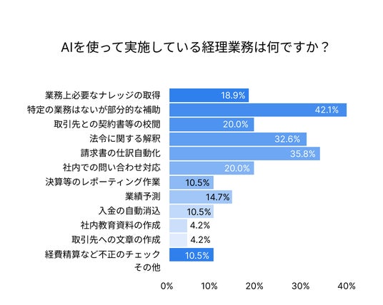AIを活用している業務を調査したところ、上記グラフのように「特定の業務はないが部分的な補助」(42.1%)が最多で、完全な自動化というより作業負荷を軽減するための使い方が中心となっています。「請求書の仕訳自動化」(35.8%)などの定型的な処理から、「法令に関する解釈」(32.6%)「取引先との契約書等の校閲」(20.0%)といった専門的な知識が求められる業務まで、幅広い領域でAIの活用が進んでいることが分かります。一方で、「業績予測」(14.7%)や「決算等のレポーティング作業」(10.5%)といった、より高度な判断や分析を必要とする領域では、まだ活用が限定的であることがわかります。