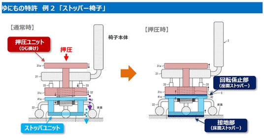 - 椅子から立ち上がる際にひじ掛けを押圧することで、その下向きの力を利用して座面の回転を止める座面ストッパー機構と、さらに連動して床面に水平な移動を止められる床面ストッパー機構を設けた。