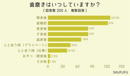 歯磨きはいつしていますか?(複数回答)の問いに対して最も多かったのが「朝食後(63.5%)」でした。 次いで「就寝前(61%)」「昼食後(41%)」という結果でした。朝食後と就寝前に歯磨きをする人が多かったです。昼食後や夕食後に歯磨きをする人も4割ほどいました。