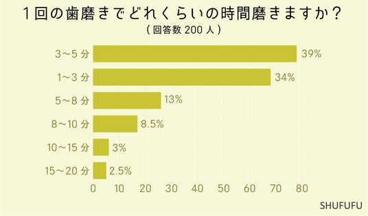 1回の歯磨きでどれくらいの時間磨くかに関しては1位「3~5分(39%)」、2位「1~3分(34%)」でした。歯磨き時間が5分以下の方がほとんどのようでした。一般的には毎食後3分以上の歯磨きが推奨されていますが、多くの人が1回の推奨時間以上の歯磨きを心がけているようです。