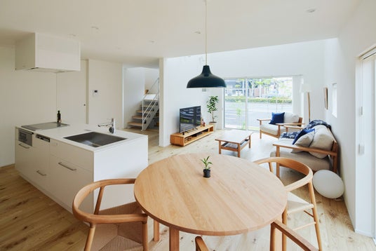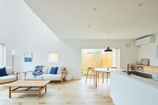 室内は白を基調とし、差し色でブルーを採用。晴れ渡った空や穏やかな瀬戸内海の「晴れの国 岡山」をイメージしています。一見シンプルに見える室内ですが、家具や小物で個性が出るようにまとめました。また、窓の家の特長の「ピクチャーウィンドウ」から見える景色は生活に彩を与えてくれる、四季の緑が見えるようになっています。「窓の家」のコンセプト