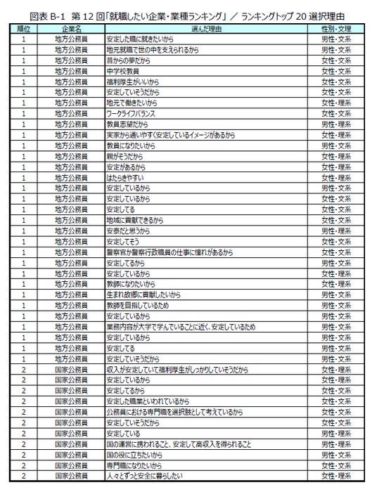今回調査でも、過去の調査結果と同様に「公務員」の人気が高く、学生の「安定」志向が継続していることが明らかになりました。