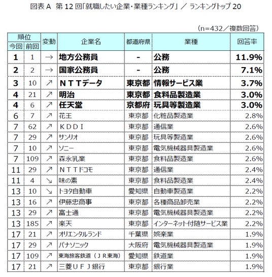 「就職したい企業・業種ランキング」のランキング1位は、「地方公務員」(回答率11.9%)となりました。次いで「国家公務員」が2位(同7.1%)、「NTTデータ」が3位(同3.7%)、4位は「明治」、「任天堂」(同3.0%)と続きました。