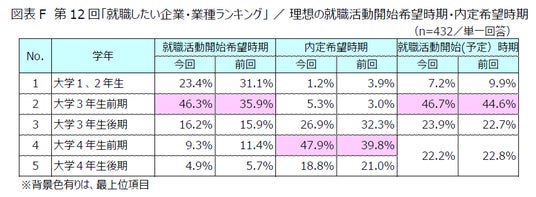 理想の就職活動開始時期について調査したところ、理想(希望)の開始時期と実際の開始時期がともに「大学3年生前期」(回答率 理想46.3%、実際46.7%)が最多となり、3年進級時に集中しています。また、理想の内定希望時期は「大学4年生前期」(同47.9%)が最多となり、大学3年生後期までに内定を獲得したい学生(合計回答率33.4%)と合わせると、8割以上が大学4年生前期までに就職活動を終了させたいと考えていることが明らかとなりました。(図表F)