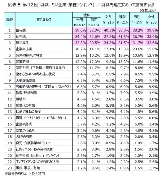 就職先の選定において重視する点を聞いたところ、1位「給料額」(回答率 39.0%)、2位「勤務地」(同34.4%)、3位「福利厚生」(同32.8%)となりました。今回調査では前回2位の「給料額」が1位と変動したものの、上位3項目が重視される傾向に変わりはなく、就職先選定の重要項目であることが示されています。(図表E)