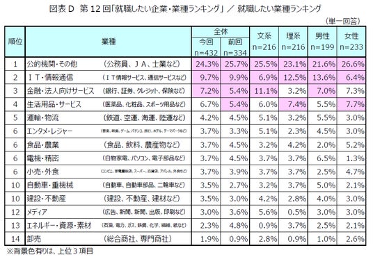 就職したい業種のランキングを見ると、1位「公的機関・その他」(回答率24.3%)、2位「IT・情報通信」(同9.7%)、3位「金融・法人向けサービス」(同7.2%)となり、トップ3の業種は前回順位と同様でした。