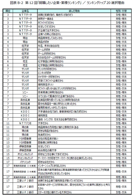 トップ20の業種をみると、食料品製造業(明治、森永乳業、味の素)、電気機械器具製造業(ソニー、富士通、パナソニック)が3社ランクインし最多となったほか、公務(地方公務員、国家公務員)、玩具製造業(任天堂、サンリオ)、通信業(KDDI、NTTドコモ)に複数企業がランクインしています。