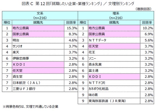 就職したい企業を文系・理系別に集計したところ、前回調査から引き続き、文系・理系ともに「地方公務員」、「国家公務員」がトップ2を占めました。文系と理系の両方にランクインした企業は「任天堂」と「KDDI」の2社でした。