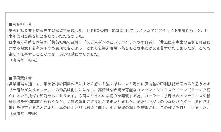 イラストの色彩クオリティを余すことなく表現できる廣済堂が持つ高品質な印刷技術は、各出版社より高い評価を得ており、2020年4月に国内で販売された「PLUS/SLAM DUNK ILLUSTRATIONS 2」(集英社)でも、印刷と製本を担当いたしました。