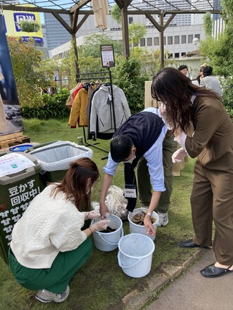 出店ショップから出る豆かすを収集し、Tシャツやコーヒー染めのトートバッグ等にアップサイクルをします。三陽商会独自の技術により、コーヒー豆かすを繊維に練り込み、リサイクルポリエステルと混合することで、衣服やバッグに生まれ変わります。今年度のイベント当日スタッフが着用しているTシャツは昨年のコーヒーフェスティバルで収集した豆かすから出来ているTシャツです。