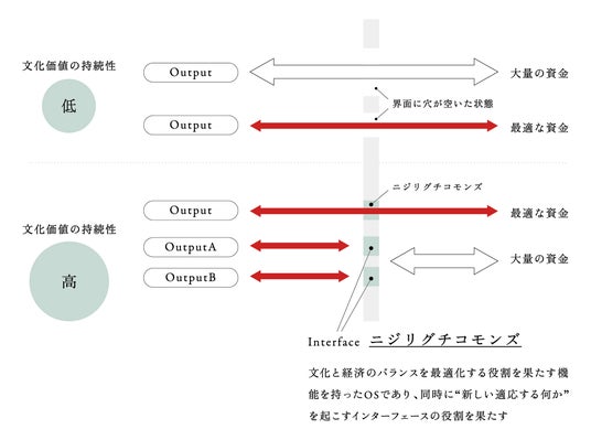 企業、京都市、ロフトワークが共にディスカッションを重ね、持続的繁栄を目指す都市構想モデル「創造的都市、京都」の仕組みとしてKYOTO_MODEL001 “ Interface ” を提案しています。京都の中核にある価値を維持するために、躙口(ニジリグチ)的インターフェースをOSとして設計することを仮説としています。躙口とは茶室に入るときの出入口で、千利休が草庵茶室・待庵に設けた小さな入口がはじまりと言われています。本プロジェクトでは、躙口を経済合理性が文化よりも優位に働くことを無効化するシステムとしてとらえ、“ニジリグチコモンズ” として表現し、文化と経済のバランスを最適化する役割を果たす機能を持った仕組みであり、同時に“新しい適応する何か”を起こすインターフェースとして提案しています。