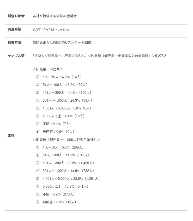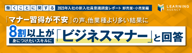 株式会社ラーニングエージェンシー(本社 東京都千代田区、代表取締役社長 眞崎大輔、以下「LA」)および人と組織の未来創りに関する調査・研究を行うラーニングイノベーション総合研究所では、2023年4月1日~5月25日の期間、2023年入社の新入社員5,623人を対象に「新入社員意識調査」を行いました。今回は、卸売業・小売業に入社した新入社員の結果を公表します。