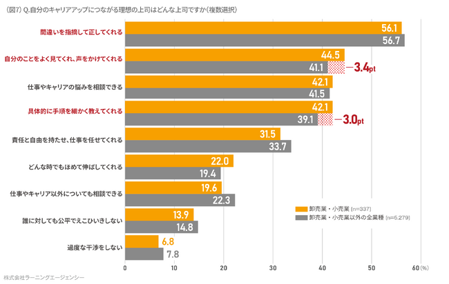 他業種と比較すると、「自分のことをよく見てくれ、声をかけてくれる」が3.4ポイント、「具体的に手順を細かく教えてくれる」が3.0ポイント高い割合となりました。