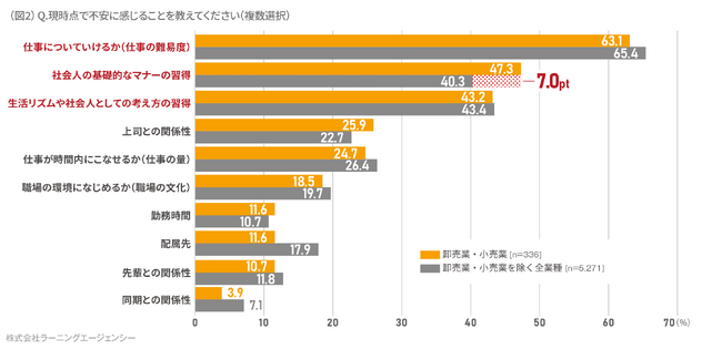 他業種との比較においては「社会人の基礎的なマナーの習得」が他業種よりも7.0ポイント高い結果となり、卸売業・小売業の新入社員は、他業種よりも社会人としてのふるまいに不安を感じていることがわかります。(図2)
